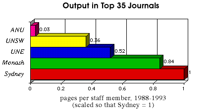 The results for ANU relate only to the ANU teaching department; if their research school was included, ANU would most likely do much better. From the perspective of quality, Australian econometric departments are far more centralised than their counterparts in economics. As such, the problem of sensitivity is less severe here. Nevertheless, we still present the results for Group 1 and Group 2 together. This time, the orderings are invariant to this change (see below).